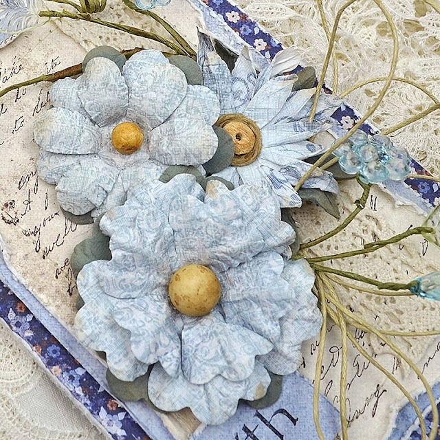 The base of the card is prepared by distressing, layering, and stitching the design papers. The flowers that comprise the focal point are ones I received last year and rescued from my stash.